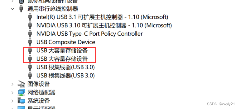 2.在保持移动硬盘插在电脑usb接口的情况下,同时按下windows键+,选择设备管理器,找到通用串行总线控制器,点开小三角折叠菜单,将图中红框中两项右键卸载,此时任务栏中硬盘弹出选项消失,将硬盘拔出。
