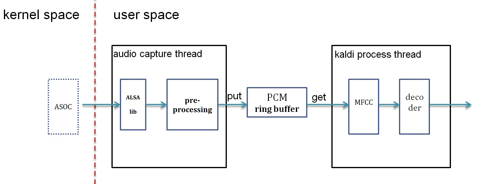 第一阶段主要是学习,第二阶段就要真正干活了。我们在Linux上开发,先制定系统搭建完成后的目标:设备用数据线连在PC上,能在线实时识别英文数字0—9(选识别这些是因为网上有现成的英国人说的音频源,我们可以省去录音频源的工作,好节约时间),即人对着设备说出英文数字0—9后PC屏幕上能实时打印出来,识别率接近GMM-HMM模型下的较好值。大家的任务还是沿袭第一阶段的。学习数据准备和MFCC的同学先数据准备相关的工作,如标注等,好给模型训练的同学用,然后移植kaldi中MFCC相关的代码。学习模型训练的同学先开始模型训练的准备工作,等要准备的数据好了后就开始训练。我负责整个软件架构的设计,同时还要把kaldi中的绝大部分(除了MFCC)移植进我们系统中。通过对kaldi的学习,使我对怎么设计这个在线语音识别的软件架构有了更深的认识。语音识别分两个阶段,即训练阶段和识别阶段。训练阶段就是得到模型给识别阶段用。它相对独立,我们就基于kaldi来训练模型,最终得到final.mdl等文件给识别阶段的软件用(在初始化时读取这些文件得到解码网络)。识别阶段的软件主要分两部分,声音采集和识别(包括特征提取和解码)。这样系统就有两个thread,一个是声音采集thread(audio capture thread),它基于ALSA来做,负责声音的采集和前处理(如噪声抑制),另一个是识别thread(kaldi process thread),负责MFCC和解码。两个thread通过ring buffer交互数据,同时要注意数据的保护。这样系统的软件架构框图如下: