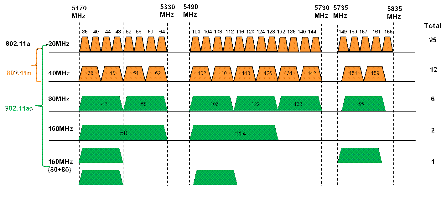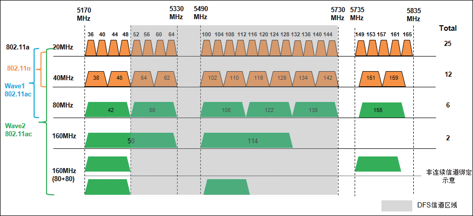 在IEEE的802.11n协议中,可以支持20MHz和40MHz两种带宽。其中20MHz信道带宽是必选的,40MHz信道是可选的。在IEEE的11ac协议中,可以支持20MHz、40MHz、80MHz、80+80MHz(不连续,非重叠)和160MHz,其中20MHz、40MHz、80MHz是必选的,80+80MHz和160MHz是可选的。在WFA的802.11ac Wave1阶段,支持20MHz、40MHz、80MHz;在WFA的802.11ac Wave2阶段,增加支持160MHz,并且160MHz可以是连续的,也可以通过不连续的非重叠带宽绑定实现。下图为北美频谱为例,给出了802.11ac Wave1、802.11ac Wave2、802.11n以及802.11a的对比。