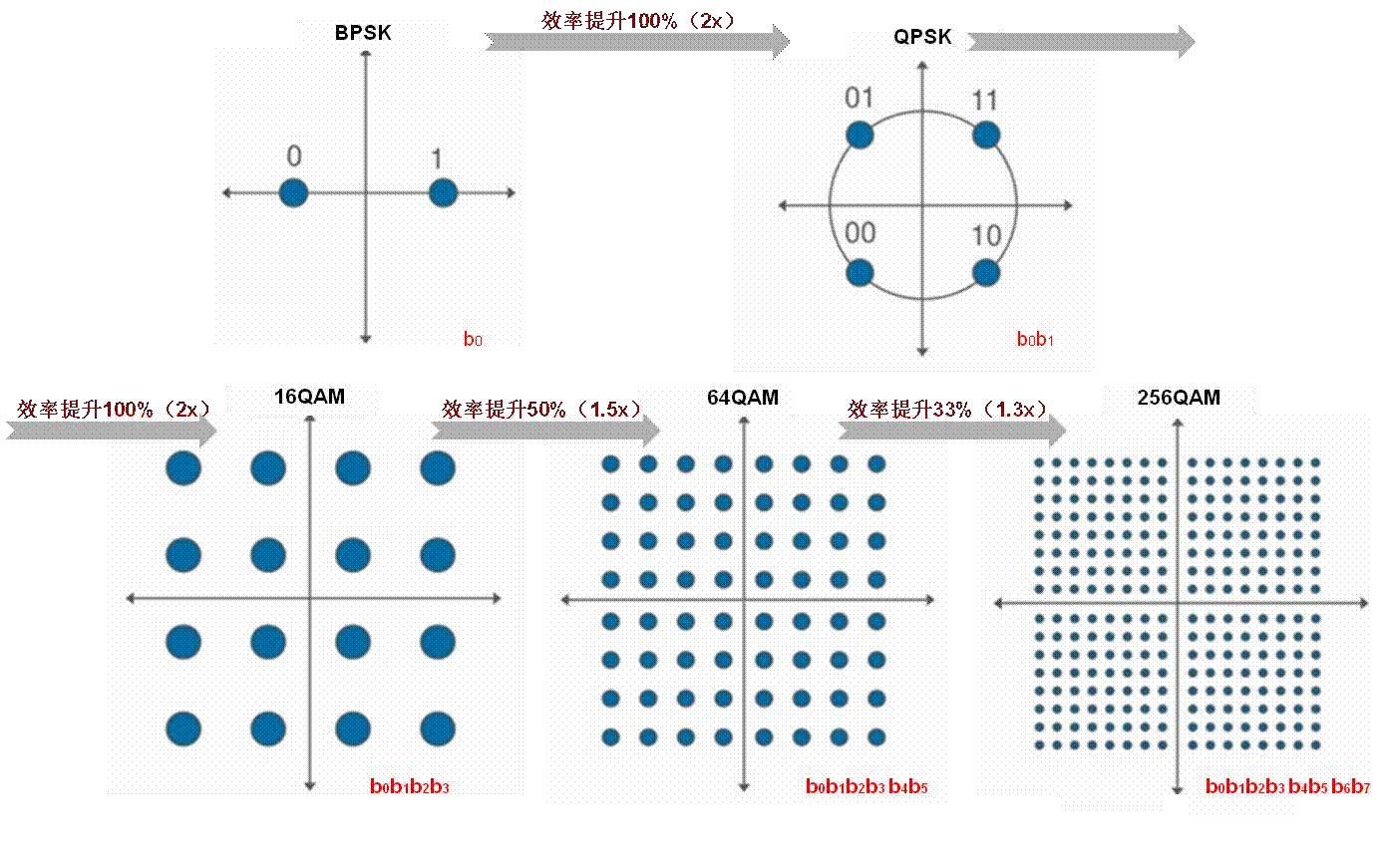 为了提高吞吐率,在802.11ac中引入调制效率更高的更高阶调制方式256Q-AM。支持3/4和5/6两种码率,MCS方式也因此增加到了10种。在MCS的表示上,802.11ac中放弃了原来为每个MIMO组合进行MCS编码,因此MCS编码方式也由原来的几十种变成了10种。MCS越高,吞吐率越高,这是由于调制编码方式的区别带来的每个子载波代表的bit数的差异。在使用BPSK调制时每个子载波只能表示2个bit,16-QAM时每个子载波表示4个bit,64-QAM时,每个子载波表示6个bit,而在引入256-QAM后,每个子载波可以表示8个bit。下图给出了从BPSK到256-QAM时的星座图,越高阶得调制方式调制效率越高,但不同调制方式时的效率提升也并不是成线性的,越往后提升越不明显。