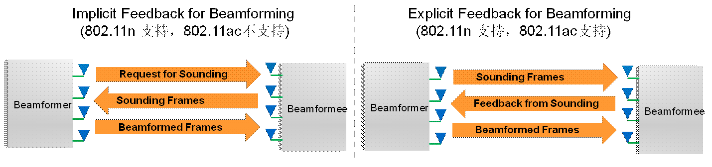 - 在802.11n中定义了两种波束成形的方式:显式波束成形和隐式波束成形,但在802.11ac中仅支持显式波束成形。