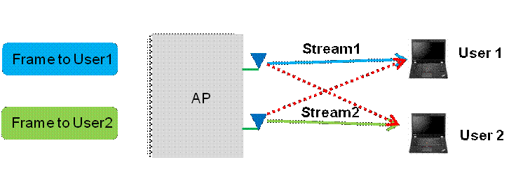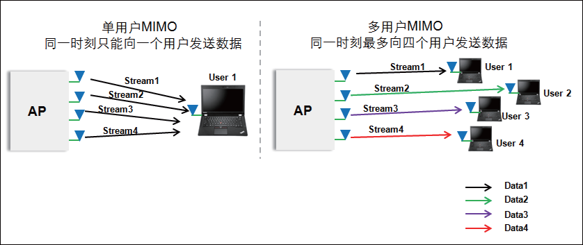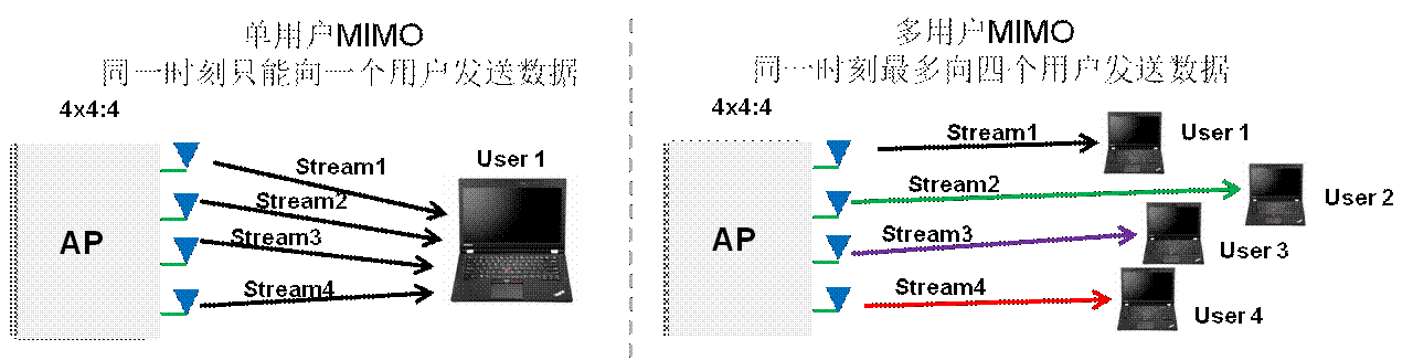 多流可以大大增加单用户的吞吐率,但现网中大量终端(尤其是移动智能终端)仍然是单流。单流的终端相对于多流的终端传输相同的大小的数据需要占用更多的空口时间,因此,单流终端成为提升接入用户数的一个瓶颈。多用户MIMO是解决这问题的一个好办法。在不改变用户带宽和频率的情况下,在同一时刻,一个AP可以同时给多个用户(最多支持4个用户)发送不同的数据。
