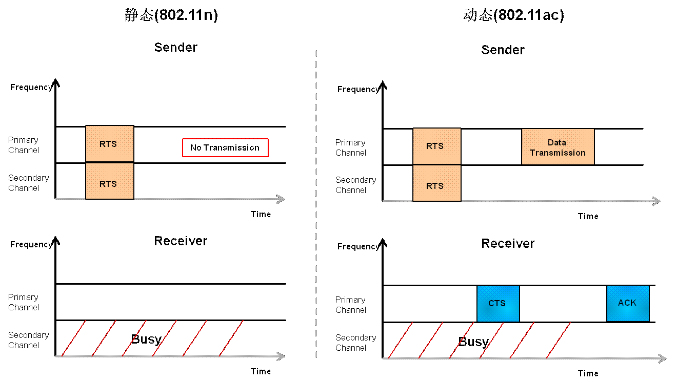 如图1-8所示,在原来802.11n的时候,频谱是使用静态的,即发现一个子信道上不可用则整个带宽都不可用,而在802.11ac中,当检测到繁忙的子信道不可用时,其他子信道仍然可以发送数据。