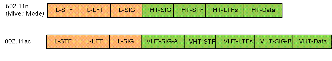 在原来802.11n中的物理层定义了两种不同的前导,一种是Greenfield格式,一种是Mixed格式。Greenfield完全不考虑与以前系统的兼容性,一直备受争议,在802.11ac中已完全放弃了Greenfield格式,而对于Mixed格式也进行了改进,以保证其现有设备良好的兼容性。