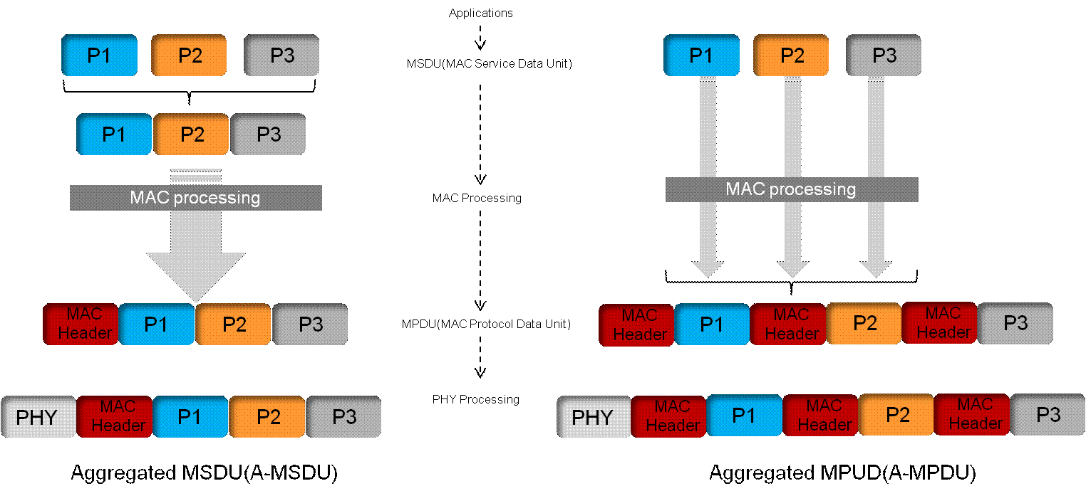 在Wi-Fi中每一个帧的传输都需要在空口中进行,通过CSMA/CA的方式取得对空口的使用权。大量帧传输时,这种碰撞大大降低了空口的利用率。从802.11n开始,在MAC层引入了帧聚合技术,将MSDU或MPDU进行聚合后再进行物理层封装,使得多个帧使用同一个物理头,提高封装效率,减少对空口的占用和争抢次数。