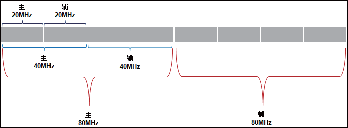 与HT20、HT40和HT80信道一样,每一个HT160也是由一个主信道(Primary 80MHz channel)和一个辅信道(Secondary 80MHz channel)两部分组成。如图1-14所示,在80MHz的内也分为主40MHz和辅40MHz;在40MHz信道内也分为主20MHz和辅20MHz。