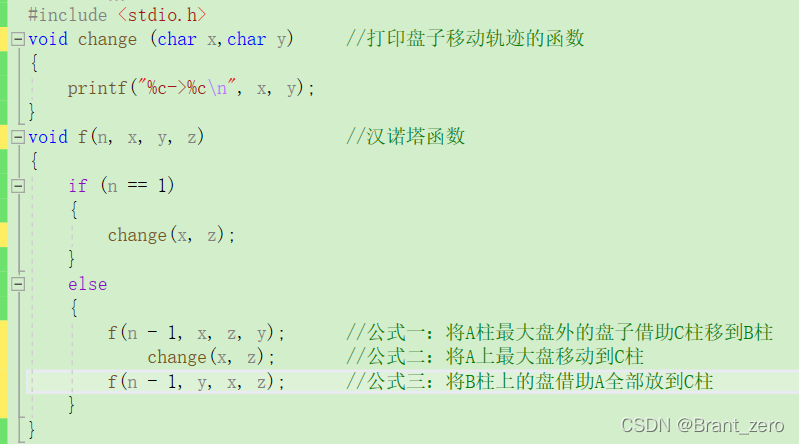 {if (n == 1){change(x, z);}else{f(n - 1, x, z, y); //公式一:将A柱最大盘外的盘子借助C柱移到B柱change(x, z); //公式二:将A上最大盘移动到C柱f(n - 1, y, x, z); //公式三:将B柱上的盘借助A全部放到C柱}