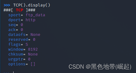 sport= ftp_data TCP源端口 dport= http TCP目的端口 seq= 0 32位序号 ack= 0 32位确认序号 dataofs= None 4位首部长度 reserved= 0 保留0位 flags= S URG,ACK,PSH,RST,SYN,FIN window= 8192 窗口大小 chksum= None 16位校验和 urgptr= 0 优先指针 options= [] 选项