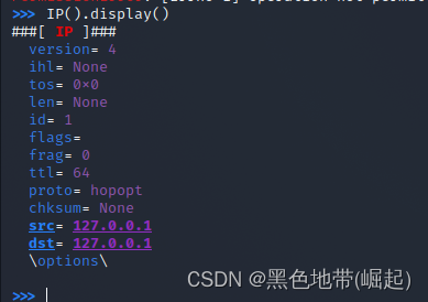 version= 4 版本:IPV4 ihl= None 首部长度 tos= 0x0 服务 len= None 总长度 id= 1 标识 flags= frag= 0 标志 ttl= 64 生存时间 proto= hopopt 传输控制协议 IPV6逐跳选项 chksum= None 首部校验和 src= 127.0.0.1 源地址 dst= 127.0.0.1 目的地址