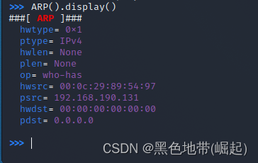 hwtype= 0x1 硬件类型 ptype= IPv4 协议类型 hwlen= 6 硬件地址长度(MAC) plen= 4 协议地址长度(IP) op= who-has who-has查询 hwsrc= 00:0c:29:89:54:97 源MAC地址 psrc= 192.168.190.131 源IP地址 hwdst= 00:00:00:00:00:00 目标硬件地址 pdst= 0.0.0.0 向谁发送查询请求
