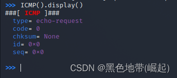 type= echo-request 类型,标识ICMP报文的类型 code= 0 编码 chksum= None 校验和 id= 0x0 标识 seq= 0x0