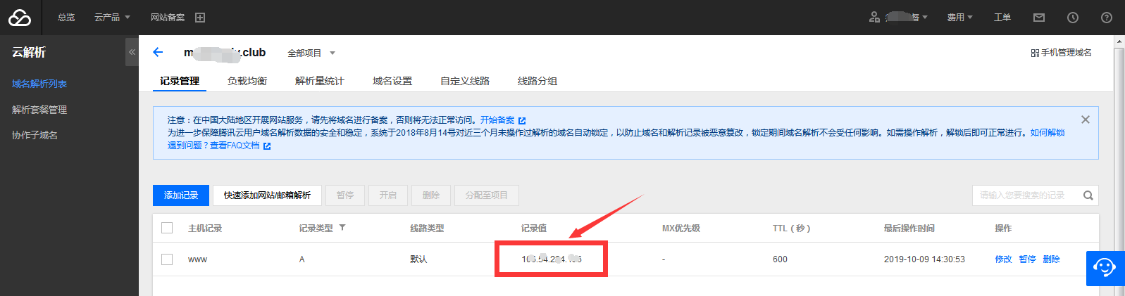 登录到腾讯云域名管理页,云产品 > 域名与网站 > 云解析,修改下更新的服务器ip。十分钟后生效,网站在腾讯云服务器成功运行。