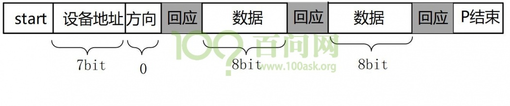刚开始主机要发出一个start信号,然后发出一个设备地址(用来确定是往哪一个从机写数据),方向(读/写,0表示写,1表示读)。