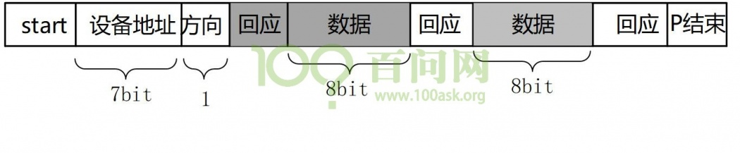 刚开始主机要发出一个start信号,然后发出一个设备地址(用来确定是从哪一个芯片读取数据),方向(读/写,0表示写,1表示读)。