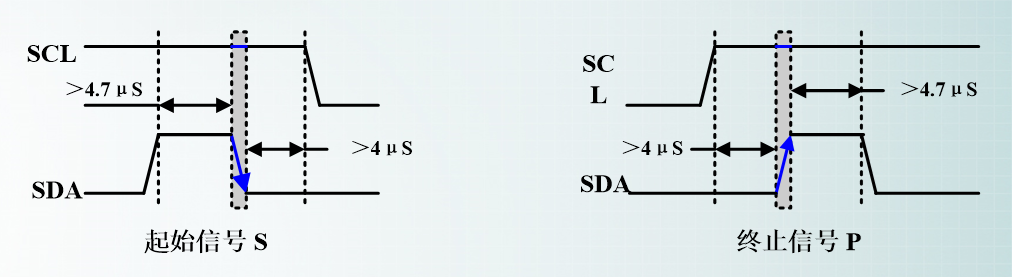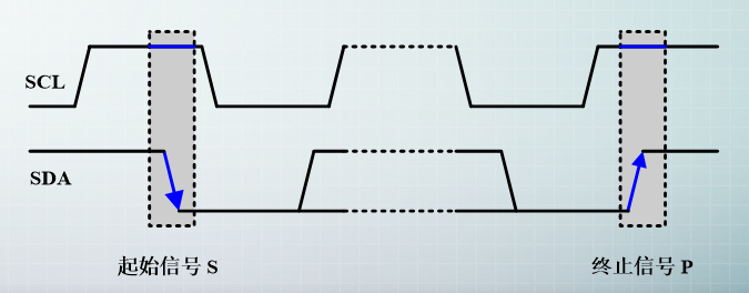 当 SCL 线是高电平时 SDA 线从高电平向低电平切换,这个情况表示通信的起始。