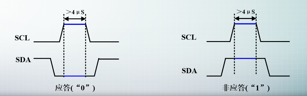 当主机发送了8位数据后,会再产生一个时钟,此时主机放开SDA的控制,读取SDA电平,在上拉电阻的影响下,此时SDA默认为高,必须从机拉低,以确认收到数据。