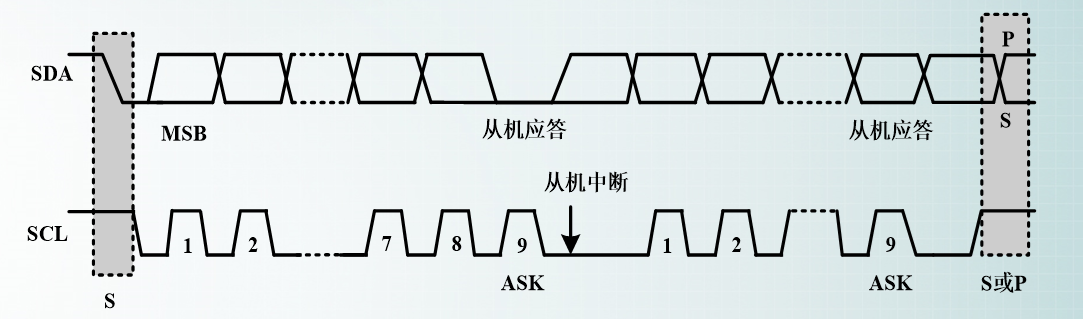 每传输一个数据,接受方都会有一个回应信号,数据发送完之后,主机就会发送一个P停止信号。