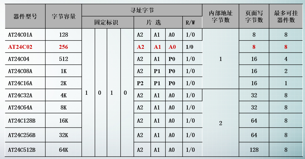 从命名上看,AT24Cxx中xx的单位是K Bit,如AT24C08,其存储容量为8K Bit。对于AT24C02,其存储容量为2K Bit,2*1024=2048Bit。