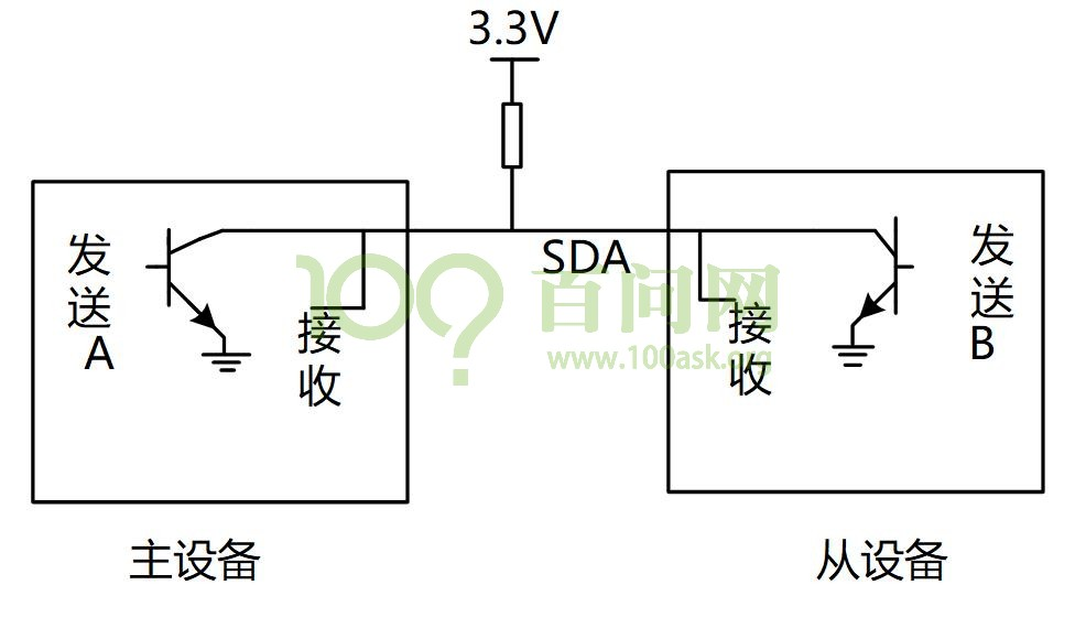 答:主芯片通过一根SDA线既可以把数据发给从设备,也可以从SDA上读取数据,连接SDA线的引脚里面必然有两个引脚(发送引脚/接受引脚)。