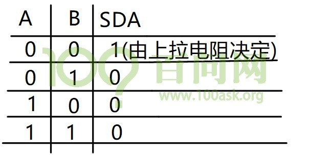 从真值表和电路图我们可以知道,当某一个芯片不行影响SDA线时,那就不驱动这个三极管。