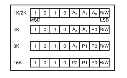 I2C设备都会有一个设备地址,不同容量的AT24Cxx,设备地址定义会有所差异:
