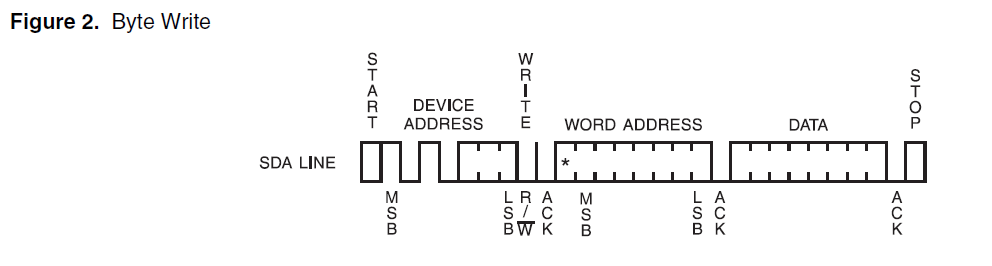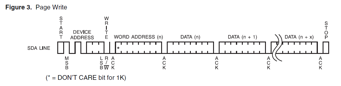 AT24C02容量为2K,因此数据地址范围为0x00-0xFF,即0-255,每个数据地址每次写1Byte,即8bit,也就刚好2568=2048Bit。对于1K容量的产品,数据地址范围为0x00-0x7F,最高位不会用到,因此图中数据地址的最高位为*,意思是对于1K容量的产品,该位无需关心。