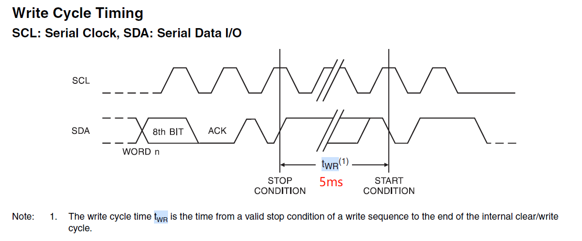 值得一提的是,AT24Cxx每次写完之后,再到下次写之前,需要间隔5ms时间,以确保上次写操作在芯片内部完成,如图所示。