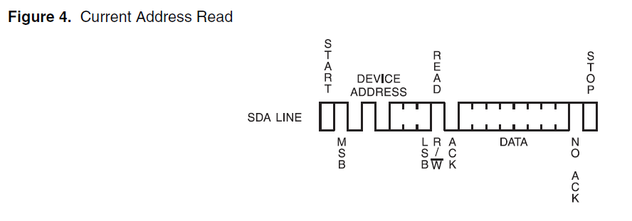 在当前地址读模式下,无需发送数据地址,数据地址为上一次读/写操作之后的位置,时序如图所示,注意在结尾,主机接收数据后,无需产生应答信号。