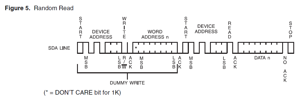 在随机地址读模式下,需要先发送设备地址,待读的数据地址,接着再重新发出开始信号,设备地址,读出数据,时序如图所示。