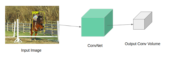取一个大小为H x W x 3的输入图像让它通过一组卷积层得到一个大小为H x W x d的卷积体,d是通道的深度或数量。