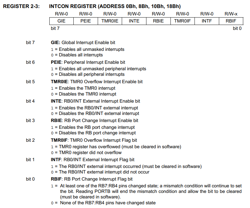 | GIE | PEIE | T0IE | INTE | RBIE | T0IF | INTF | RBIF |