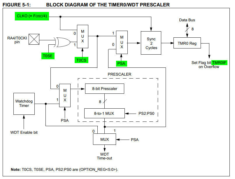 TMR0寄存器——Timer0 Module Register,是一个8位累加计数寄存器,这个不需要用户关心,是自动累加用的