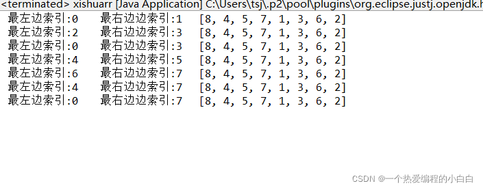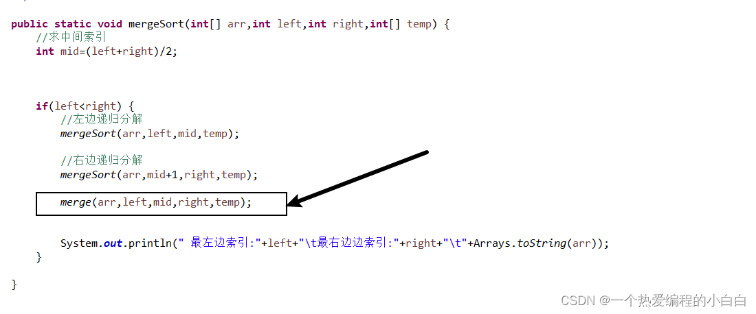 /*** 分* @param arr 排序的原始数组* @param left 左边有序序列的初始索引* @param right 右边索引* @param temp 做中转的数组*/public static void mergeSort(int[] arr,int left,int right,int[] temp) {//求中间索引int mid=(left+right)/2;if(left<right) {//左边递归分解mergeSort(arr,left,mid,temp);//右边递归分解mergeSort(arr,mid+1,right,temp);System.out.println(" 最左边索引:"+left+"\t最右边边索引:"+right+"\t"+Arrays.toString(arr));}}