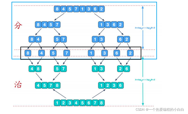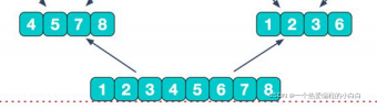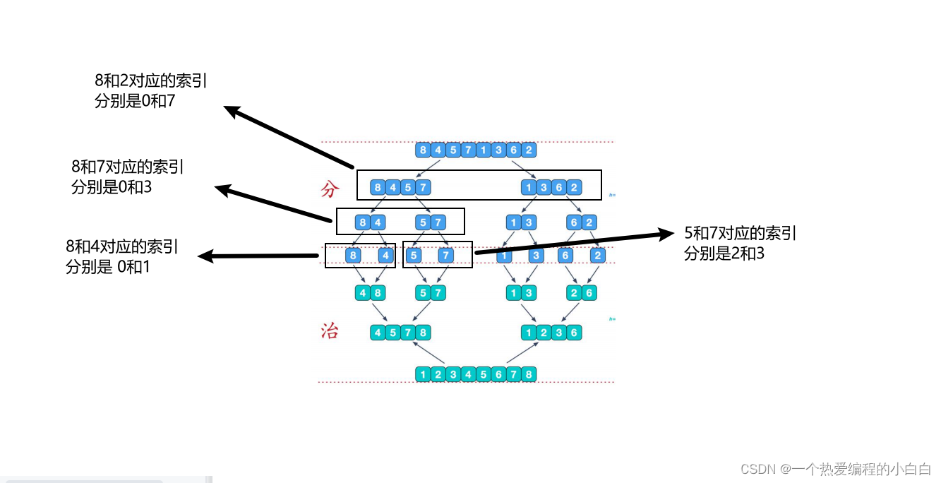 public static void main(String[] args) {int arr[]= {8,4,5,7,1,3,6,2};//假设已经到最后一步int arrys[]= {4 ,5 ,7 ,8,1 ,2, 3, 6};int[] add=new int[8];//第一个参数表示传入数组{4 ,5 ,7 ,8,1 ,2, 3, 6}//第二个参数表示这个数组的第一个位置 即是0//第三个参数表示这个数组的中间位置 (0+7)/2=3//第四个参数 存放临时数组的