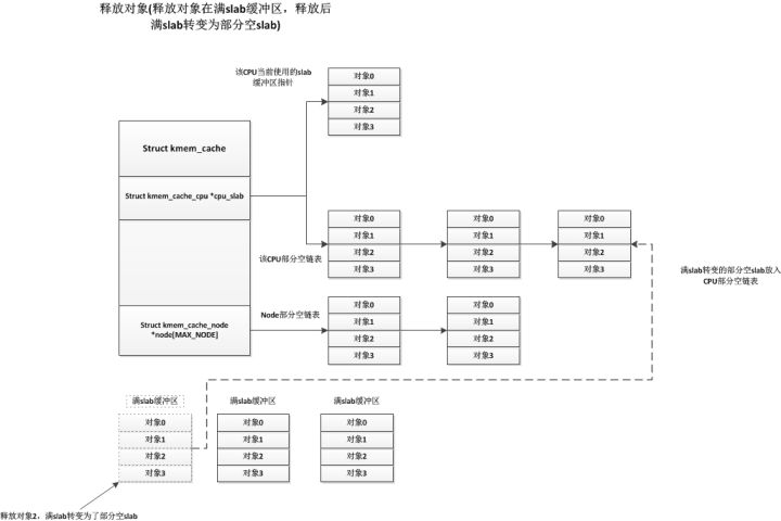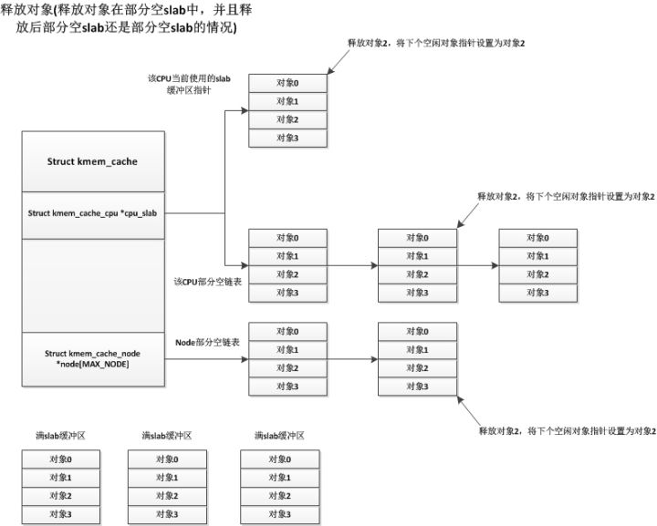各种情况的申请对象都已经说明了,接下来我们说说释放对象的情况,释放对象也分很多种,我们先说说最简单的一种释放情况,就是部分空的slab释放其中一个使用着的对象,释放后这个部分空slab还是部分空slab(有些部分空slab只使用了一个对象,释放这个对象后就变为空闲slab),这些部分空slab可能处于CPU当前使用slab,CPU部分空链表,node部分空链表中,但是它们的处理都是一样的,直接释放掉该对象即可,如下: