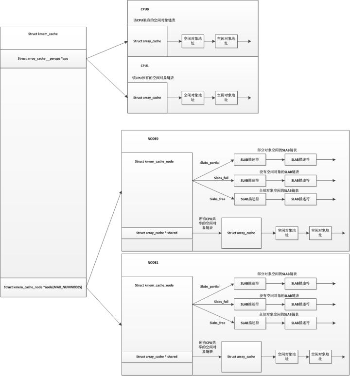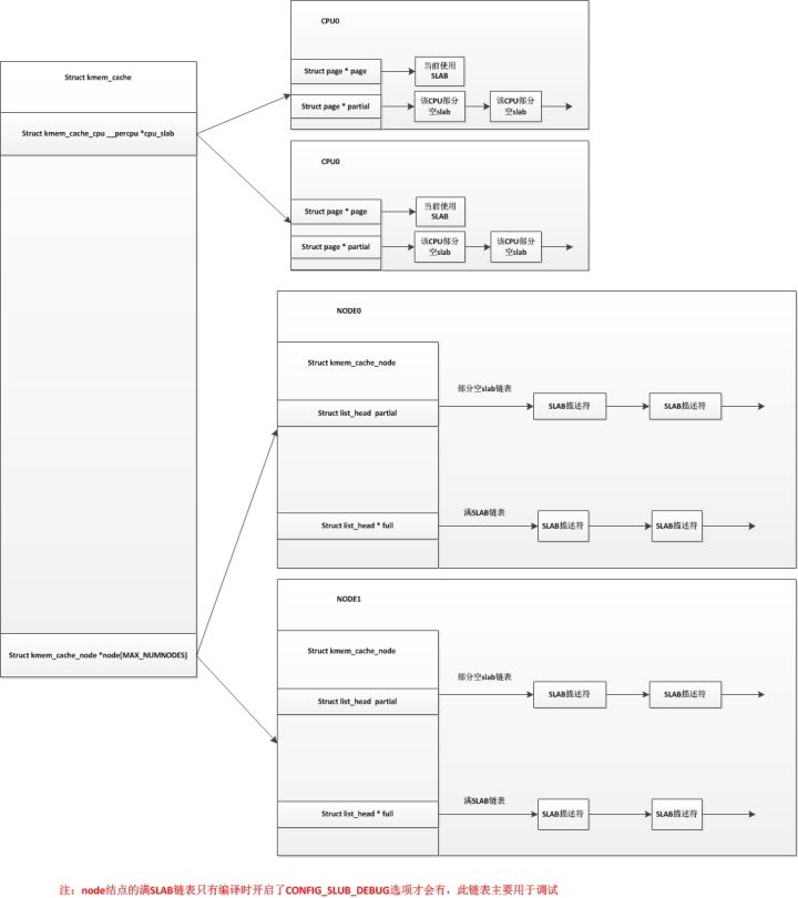 #endif/* 此高速缓存的SLAB链表,每个NUMA结点有一个,有可能该高速缓存有些SLAB处于其他结点上 */struct kmem_cache_node *node[MAX_NUMNODES];
