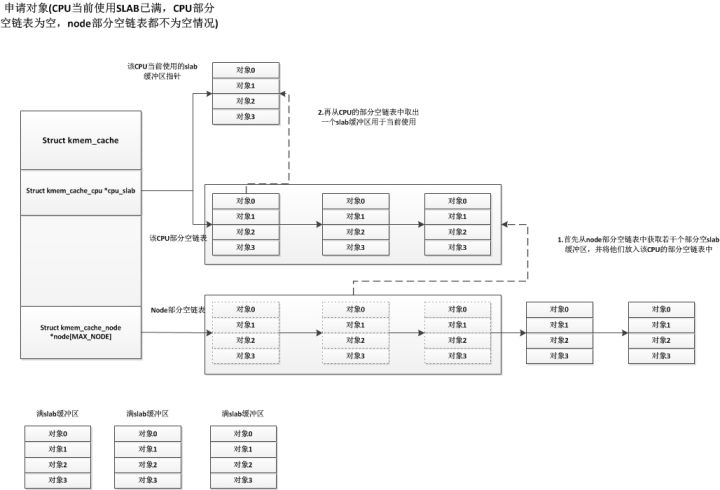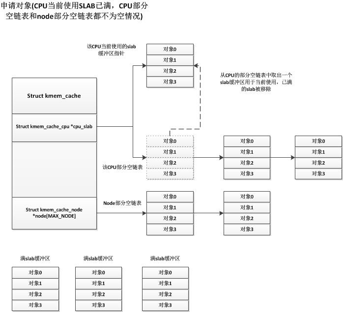 上面描述的是初始化完成后第一次申请对象的情况,现在我们描述一下运行时申请对象的情况,一种情况是当前CPU使用的slab缓冲区有多余的空闲对象,这样直接从这些多余的空闲对象中分配一个出去即可,这种情况很简单。我们着重说明CPU使用的slab缓冲区没有多余的空闲对象的情况,这种情况又分为CPU的部分空slab链表是否为空的情况,如果CPU部分空slab链表不为空,则CPU会将当前使用的满slab移除,并从CPU的部分空slab链表中获取一个部分空的slab缓冲区,并设置为CPU当前使用的slab缓冲区,如下图: