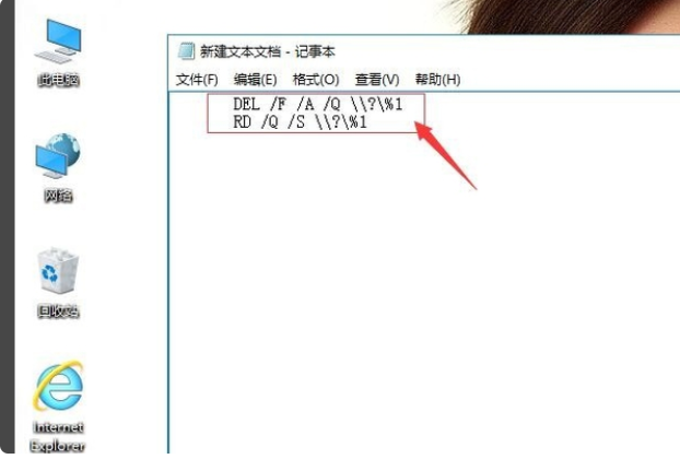 2、然后把下面代码复制,粘贴上去。DEL /F /A /Q \\?\%1 RD /S /Q \\?\%1 。
