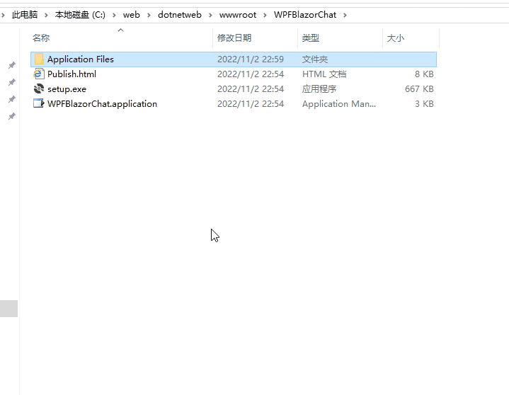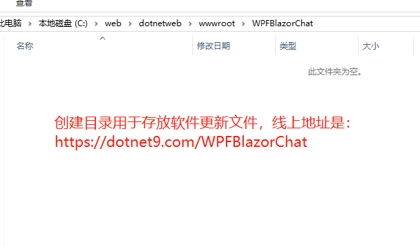 首先,我们需要一个线上的网站,用于托管软件更新文件,比如在Dotnet9网站的根目录创建一个WPFBlazorChat的目录,那么线上托管地址则是https://dotnet9.com/WPFBlazorChat,目录如下: