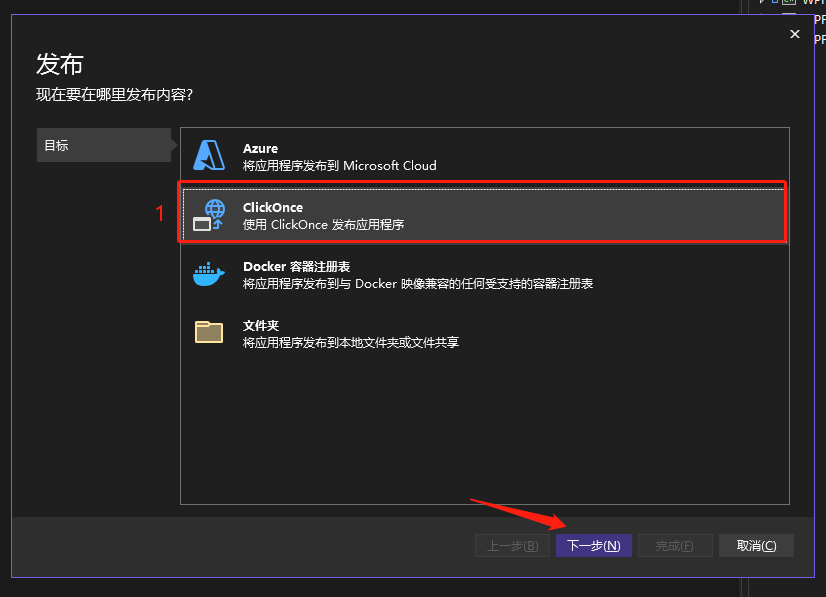 1. 在弹出的界面,选择ClickOnce,点击下一步