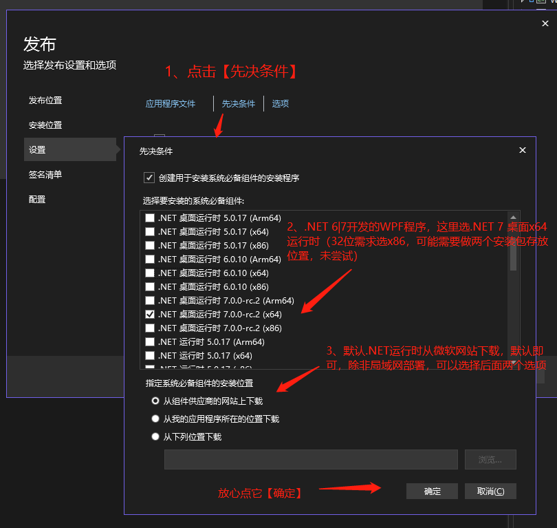 • 选择先决条件,即选择程序的运行时,因为程序默认支持.NET 6和.NET 7,所以站长勾选了.NET 7 x64,win7 32位的同学如有需要,按需选择: