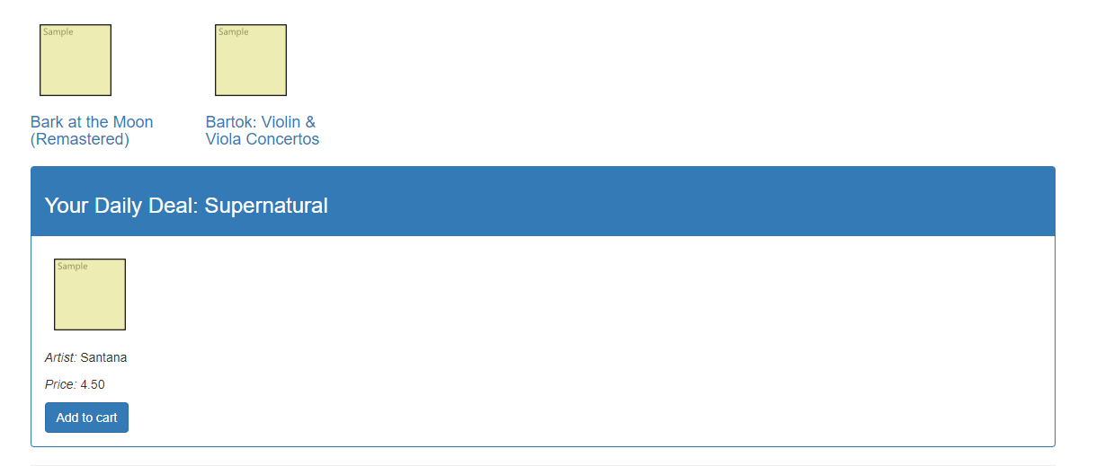 @model Chapter8.Models.Album<div class="panel panel-primary"><div class="panel-heading"><h3>Your Daily Deal: @Model.Title</h3></div><div class="panel-body"><p><img alt="@Model.Title" src="@Url.Content(Model.AlbumArtUrl)" /></p><div id="album-details"><p><em>Artist:</em>@Model.Artist.Name</p><p><em>Price:</em>@string.Format("{0:F}", Model.Price)</p>@Html.ActionLink("Add to cart","AddToCart","ShoppingCart",new { id=Model.AlbumId},new { @class="btn btn-primary"})</div></div>