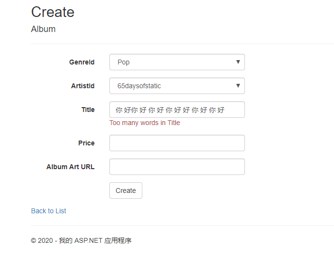 18.运行,访问Albums/Create页面,当TiTle的长度(以空格隔开)大于设定长度,提示错误信息