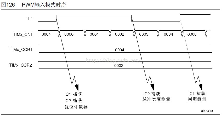 由于只有TI1FP1和TI2FP2连到了从模式控制器,所以PWM输入模式只能使用TIMx_CH1 /TIMx_CH2信号。