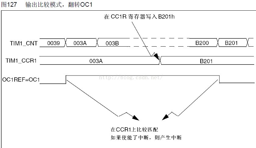 ● 若设置了相应的中断屏蔽(TIMx_DIER寄存器中的CCxIE位),则产生一个中断。