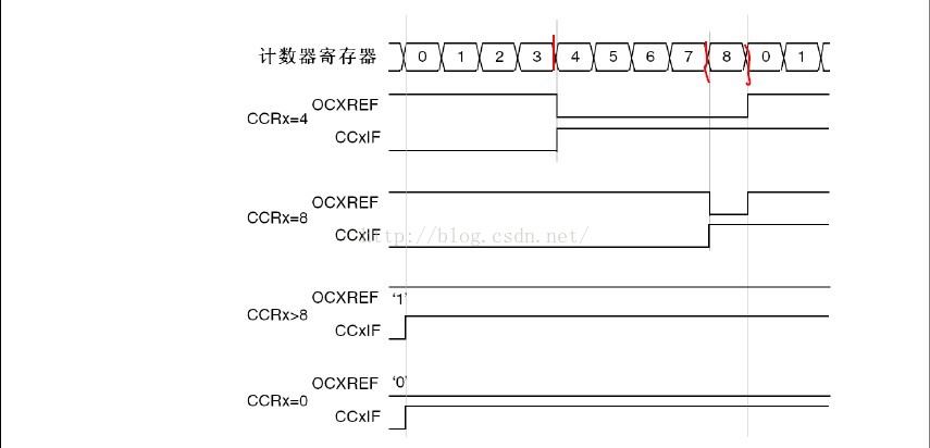 例如:CCxP=0(OCx高电平有效),则OCx被强置为高电平。 置TIMx_CCMRx寄存器中的OCxM=100,可强置OCxREF信号为低。