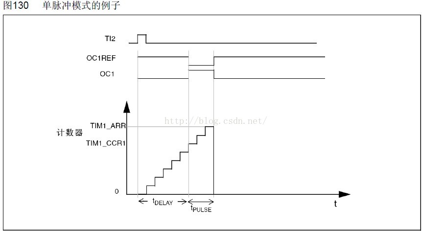 可以通过从模式控制器启动计数器,在输出比较模式或者PWM模式下产生波形。设置TIMx_CR1寄存器中的OPM位将选择单脉冲模式,这样可以让计数器自动地在产生下一个更新事件UEV时停止。 仅当比较值与计数器的初始值不同时,才能产生一个脉冲。启动之前(当定时器正在等待触发),必须如下配置: