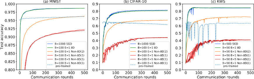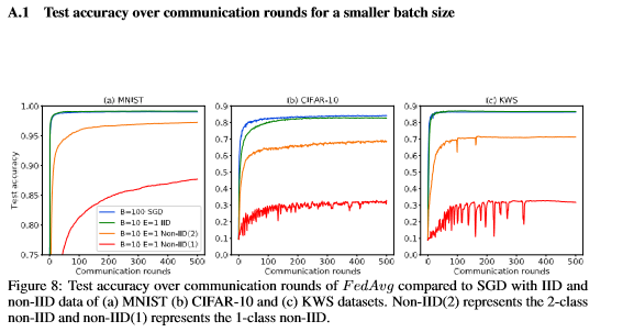图1:与使用(a) MNIST (b) CIFAR-10和(c) KWS数据集的IID和non-IID数据的SGD相比,FedAvg通信轮的测试准确性。Non-IID(2)表示2类Non-IID, Non-IID(1)表示1类Non-IID。