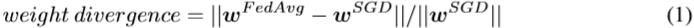 在图1和A.1中,值得注意的是,2-class non-IID数据的缩减要小于1-classnon-IID数据。这表明FedAvg的准确性可能受到精确数据分布的影响,即,数据分布的偏态性。由于测试精度是由训练后的权值决定的,另一种比较FedAvg和SGD的方法是观察初始化权值相同的情况下,相对于SGD的权值的差异。称为weight divergence,其计算公式如下: