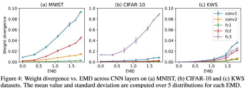 对于每个EMD,在5个分布上计算weight divergence的平均值和标准偏差。对于所有三个数据集,每层的weight divergence随EMD的增加而增加,如图4所示。每个数据集上所有SGD,IID和non-IID实验的初始权重均相同。因此,根据注释3.2,第1次同步之后的weight divergence不受第(m-1)个divergence的影响 ,因为当m = 1时为零。因此,图4中的结果支持命题3.1,即weight divergence的边界受EMD影响。在第一个卷积层和最后一个完全连接层中,这种影响更为显着。此外,CIFAR-10的最大weight divergence显著高于MNIST和KWS的最大差异,这受公式中的梯度项影响。(2)由于问题本身和不同的CNN架构。请注意,根据备注3.3,初始权重在客户端上也相同,以避免准确性损失,这与对具有不同初始化的模型求平均值时损失的显着增加是一致的[3,32]。